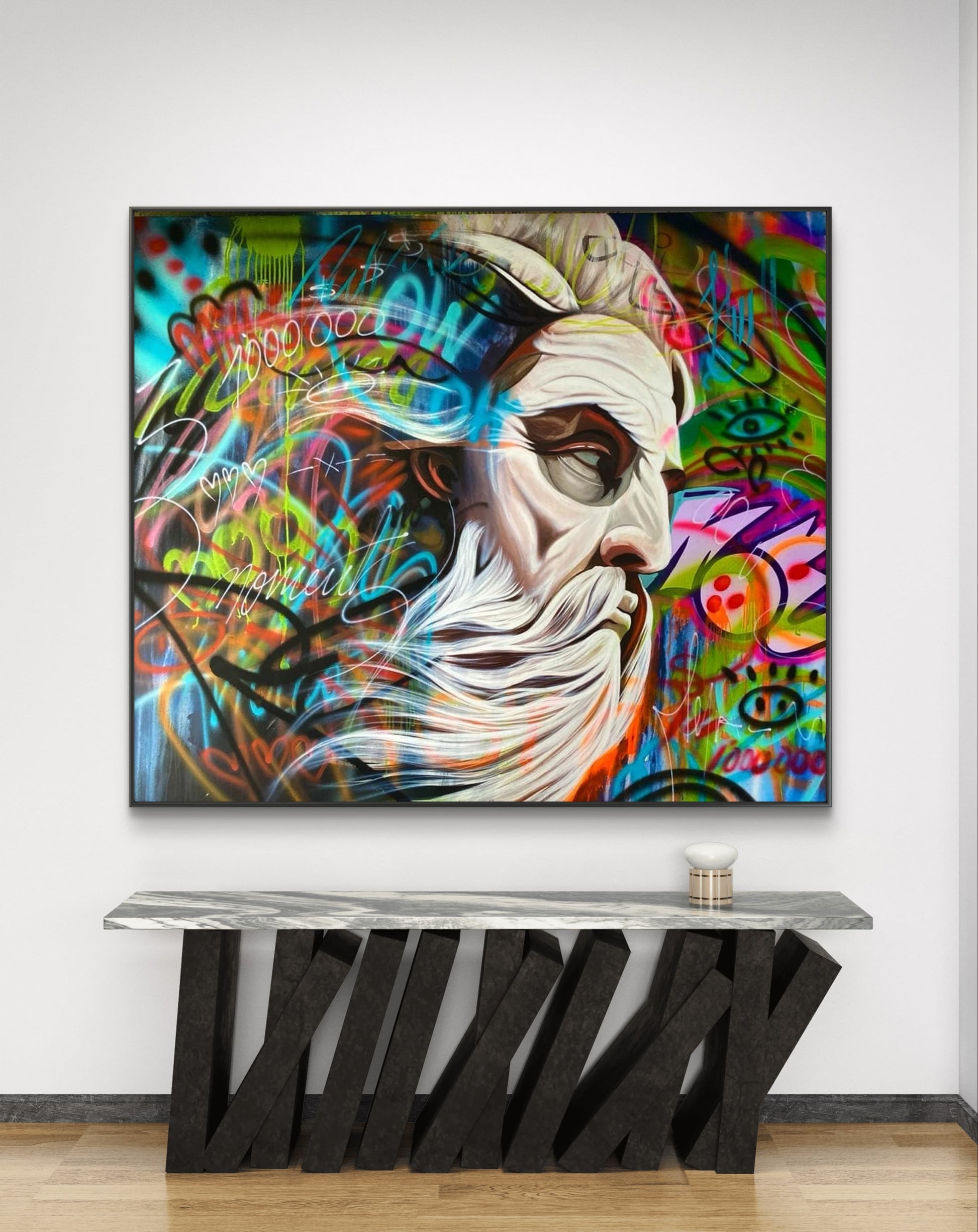 Zeus renace entre trazos urbanos, mirando desde lo alto del arte contemporáneo.